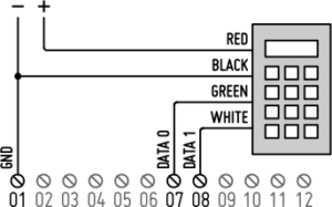 Cet exemple montre comment configurer un contrôle d’accès à l’aide de l’interface wiegand d’Avior. Connectez un lecteur WIEGAND aux entrées numériques :