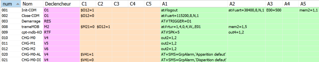 La règle 10 va détecter un changement de la valeur lue dans le premier mot Modbus ($E01>Var4). On fait juste clignoter la sortie 2 pendant 2 secondes, juste pour signaler visuellement qu’un changement a été détecté. Plus bas, les règles 20 et 21 vont être activées dans le même cycle suivant mais là on va tester la valeur du mot pour déclencher l’action que l’on souhaite, comme par exemple ici l’envoi d’un petit message SMS à tous les utilisateurs configurés dans l’AVIOR et qui appartiennent au Group: GrpAlarm. Tous les utilisateurs concernés recevront un SMS.