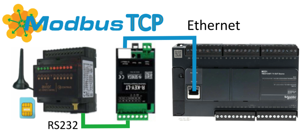 Il est possible avec AVIOR d’aller interroger des équipements présents sur un réseau Ethernet avec le protocole MOdbusTCP. Pour cela il suffit d’ajouter en interface la passerelle transparente R-KEY-LT de SENECA. Elle est assez économique. Pour la raccorder à l’AVIOR il suffit de prendre un petit cable réseau Ethernet et de sectionner pour garder une prise RJ45. 3 fils sont nécessires pour utiliser la RS232, comme indiqué sur le schéma ci-contre.