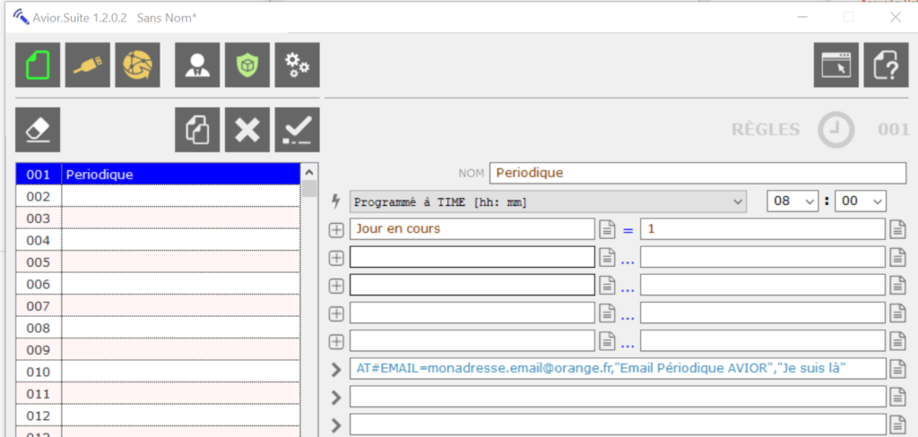 Dans la règle ci-dessus, nous avons choisi le déclencheur A HEURE FIXE et configuré 08h00 du matin. Nous avons ajouté la condition que le Jour actuel soit le Lundi (1) pour provoquer l’envoi périodique d’un email à l’adresse monadresse.email@orange.fr, avec comme sujet: Email Périodique AVIOR et le contenu de l’email: Je suis là…