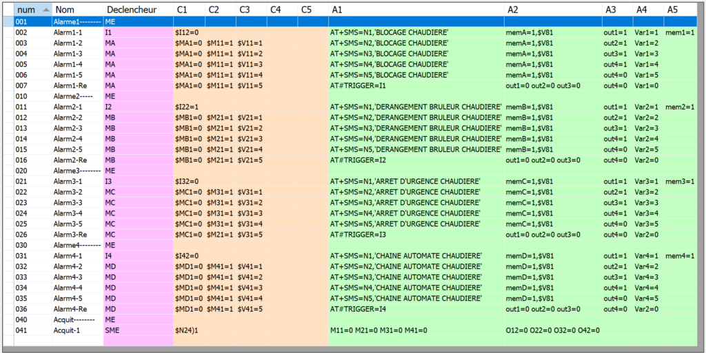 Si SMS reçu, de quelqu’un de répertorié dans la liste des utilisateurs autorisés, et que le texte du SMS est 1 (le chiffre 1), alors toutes les alarmes sont acquittées ainsi que les séquences d’envoi.