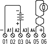 Jusqu’à 4 signaux analogiques peuvent être connectés aux bornes 02 à 06 par rapport à la borne négative 01. Le mode d’entrée et la plage peuvent être sélectionnés par logiciel pour chaque entrée.