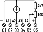 La source de courant est ici connectée à l’entrée analogique A2 (borne 03) par rapport à la borne négative (01).