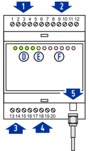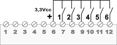 Il est possible de connecter jusqu’à 6 contacts tout ou rien aux bornes 07 à 12. L’état est signalé à l’aide des voyants Leds jaune/orange[F]. Une alimentation interne, délivrant du 3,3V est disponible à la borne 06.