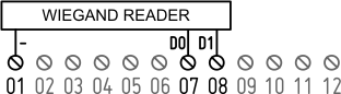 Un lecteur wiegand peut être connecté aux entrées numériques I1 et I2, les voyants sont allumés lorsque la ligne de données est connectée. Négatif (GND) vers la borne 01.