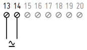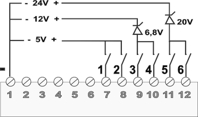 Lorsque les entrées sont alimentées par une source externe, le négatif est connecté à la borne 01; la tension doit être maintenue dans les limites de 9 V CC. Les alimentations externes des entrées doivent répondre aux exigences des circuits SELV conformément à la norme EN / IEC 62368.