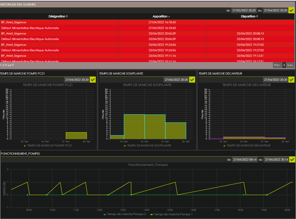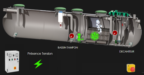 Cet autre client gère entièrement le pilotage et la surveillance de cuves de décantation. Gestion automatique des cycles de pompage, aération, poires de niveau, gestion des défauts, alerte par email et SMS.