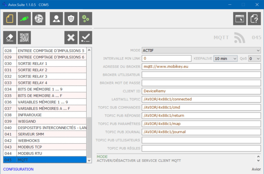 Depuis la version de firmware 02.34 et sur les AVIOR, AVIOR-ECO et AVIOR-BOX, le protocole MQTT est inclus et permet la remontée des données directement vers le Broker de votre choix.